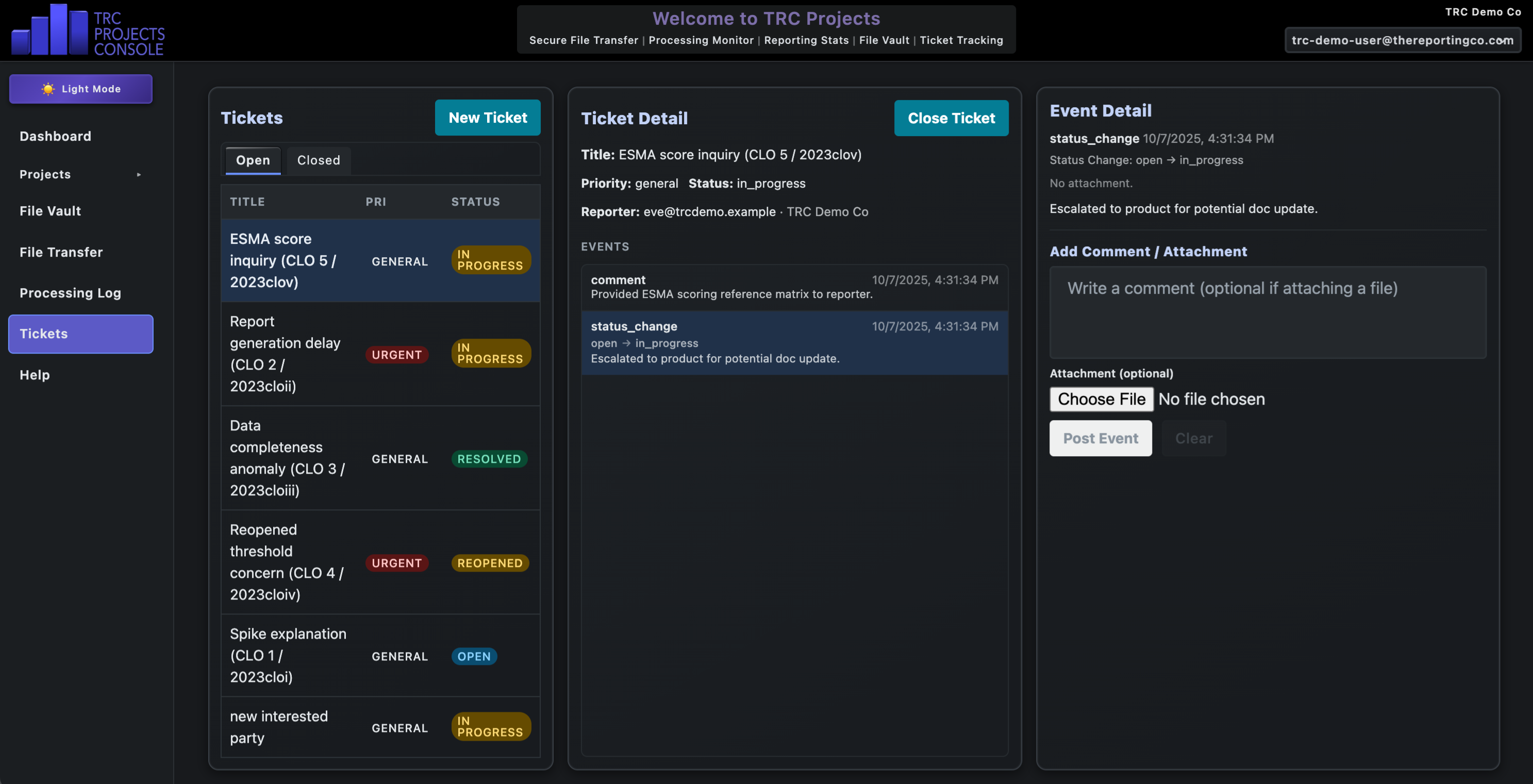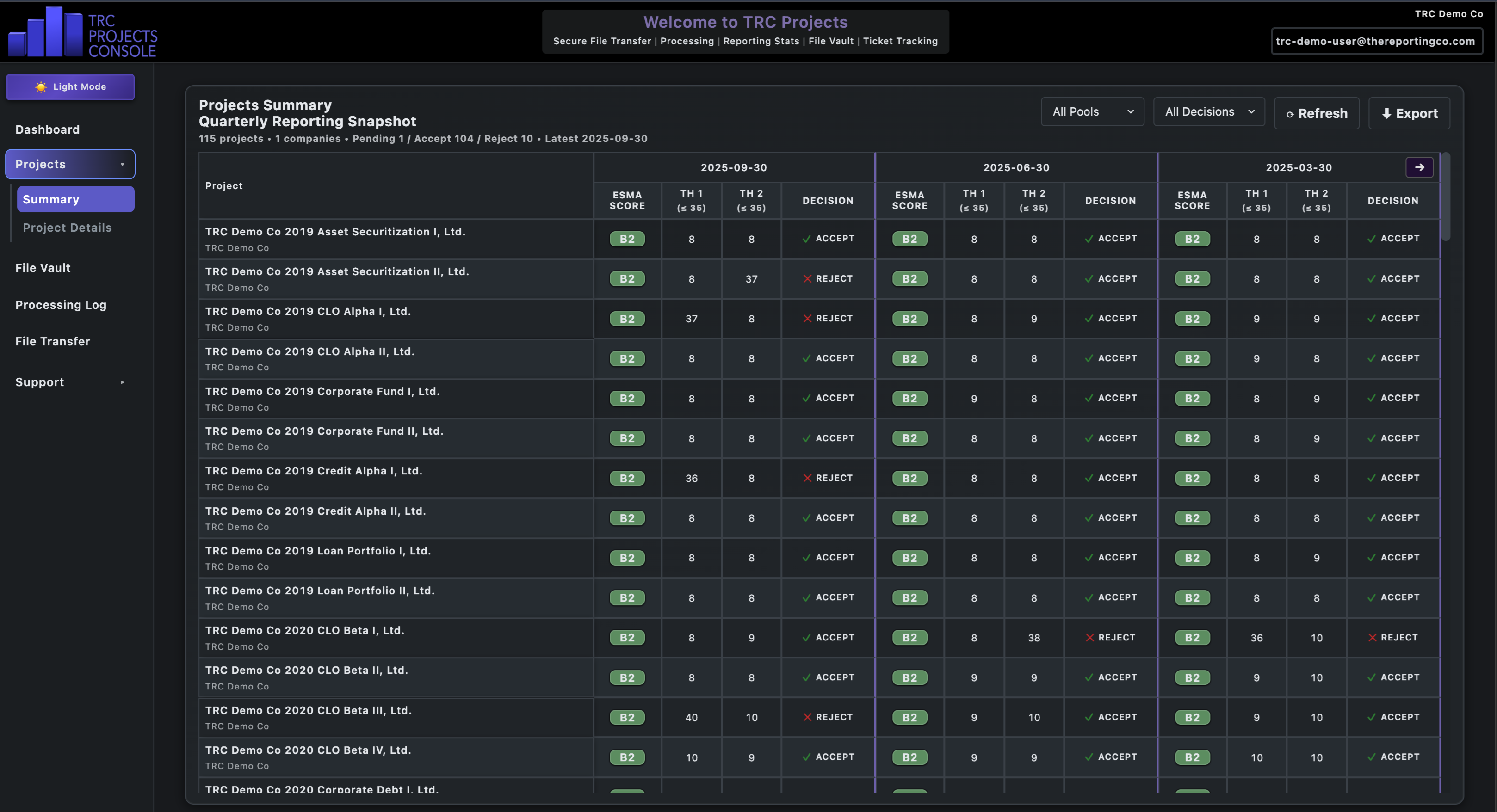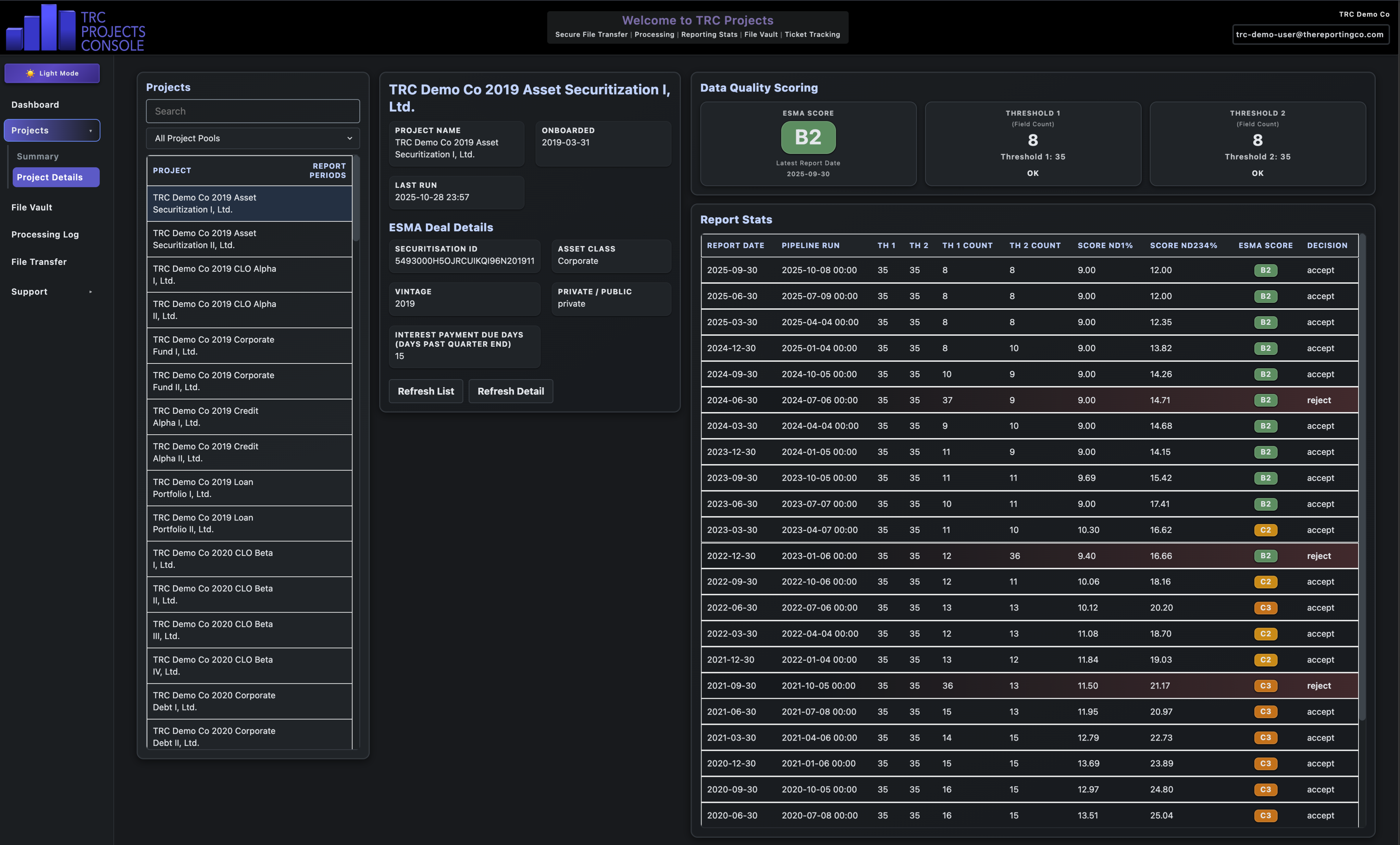 The Reporting Company ("TRC") is a global platform that automates regulatory and financial reporting for originators and servicers of securitizations and applies proprietary processes, technology integrations, and AI usages to ensure accurate, fast, and reliable reporting at scale. Clients use TRC to manage the complexities of mapping and processing data in different formats and from different sources into production reports ready to deliver to investors, and other interested parties.